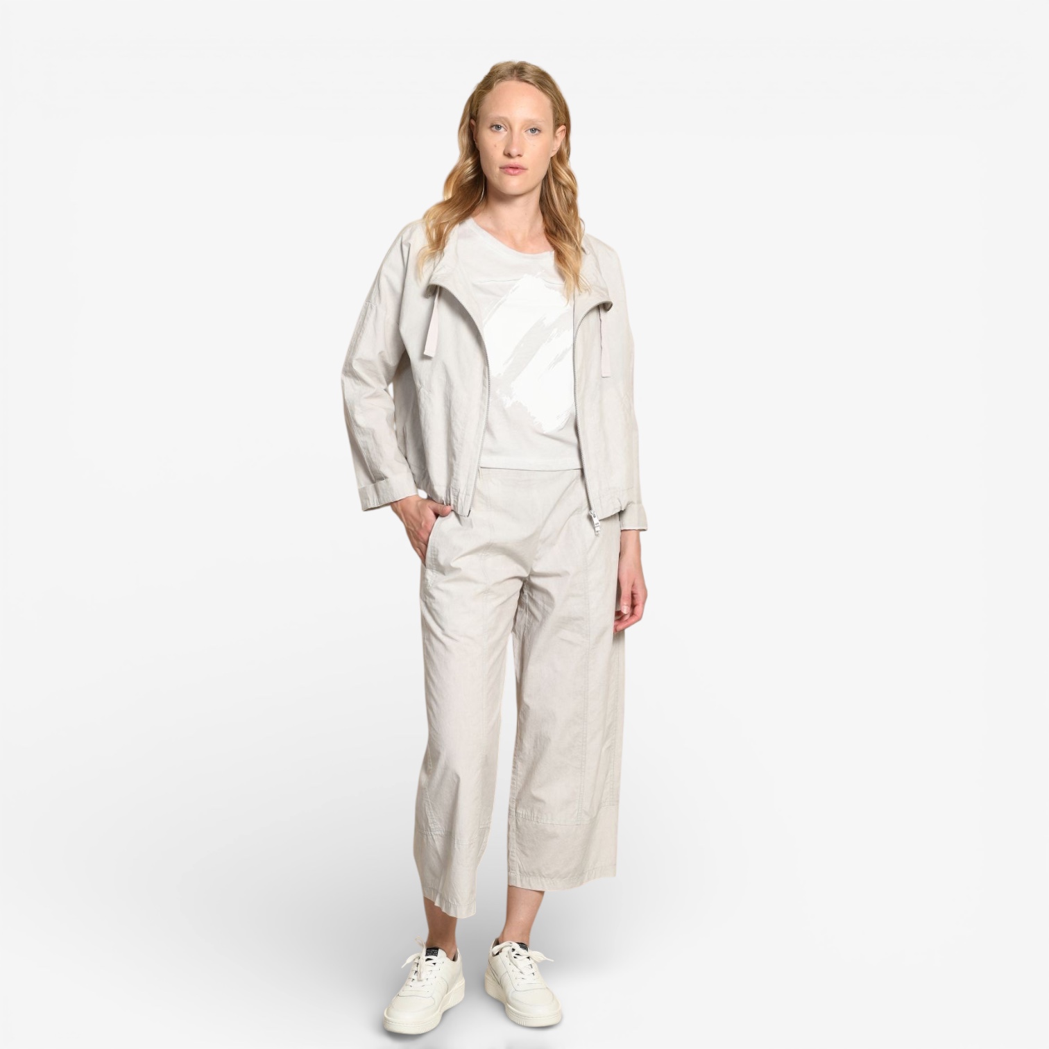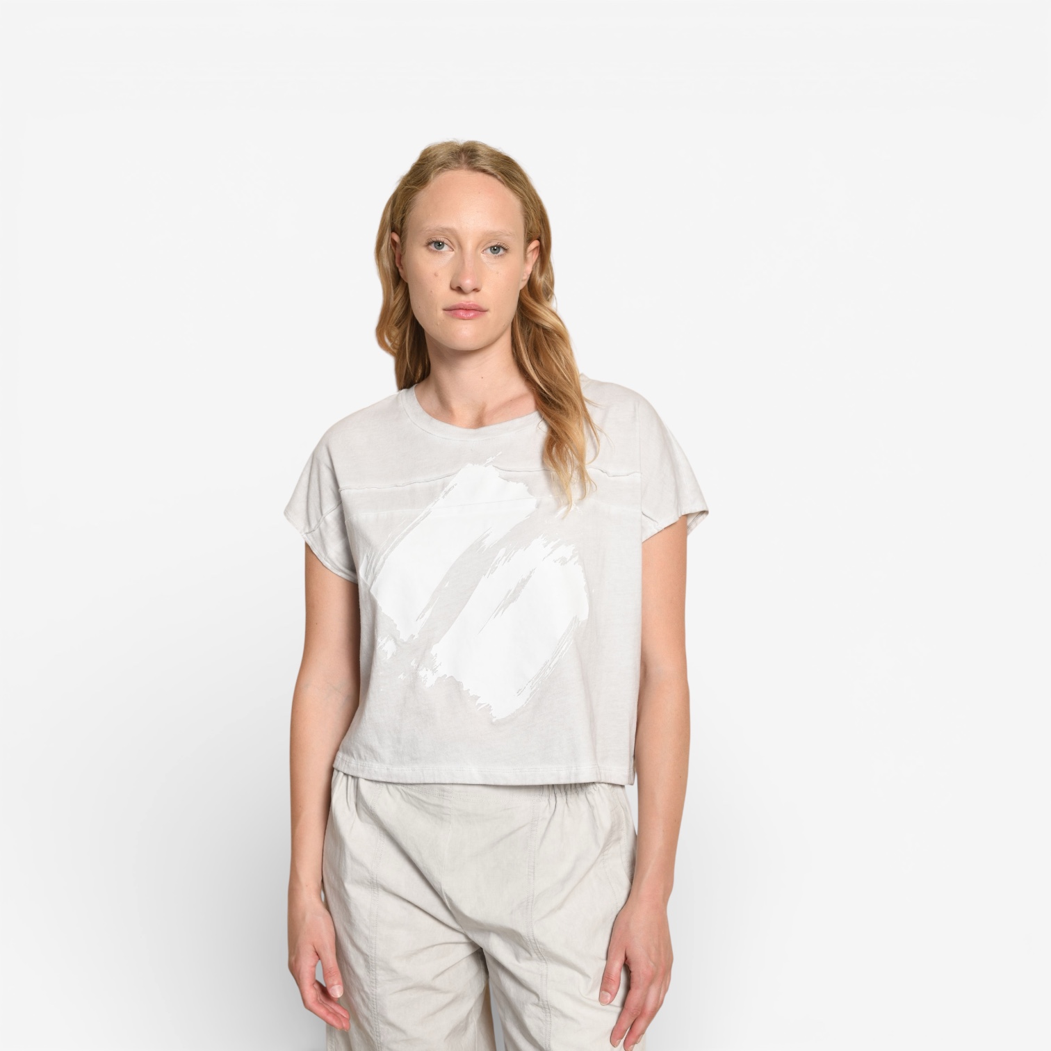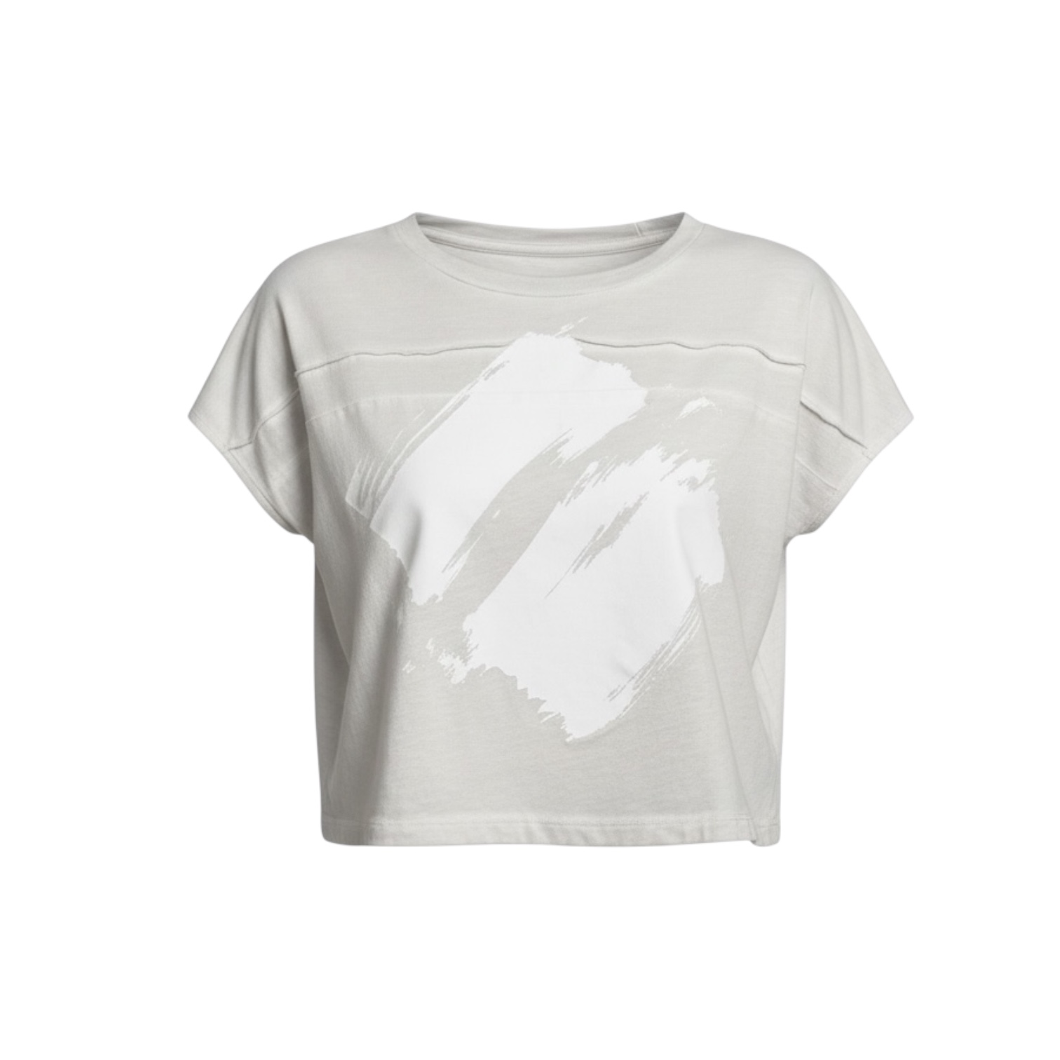 Kunst trifft Alltag: Dieses entspannte Cropped T-Shirt überzeugt mit seinem auffälligen Pinselstrich-Print in Weiß auf zartem Greige. Minimalistisch, modern und mit einem echten Wow-Faktor.