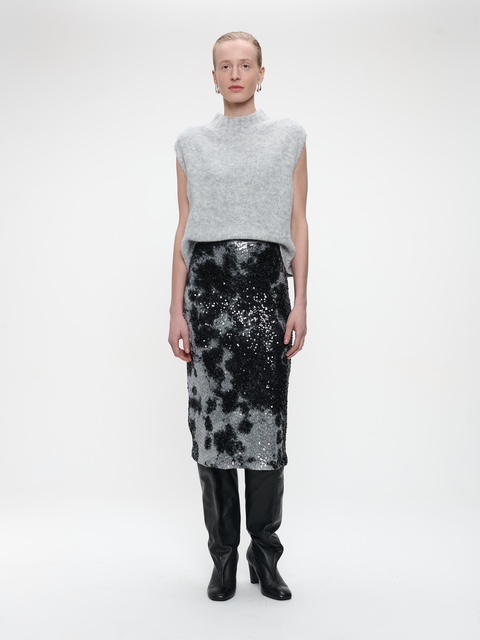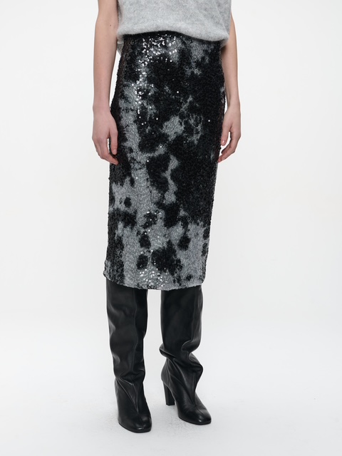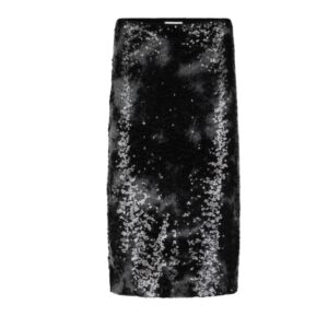 Vollflächig mit schwarzen und silbernen Pailletten besetzt, strahlt dieser Bleistiftrock pure Eleganz und Glamour aus.