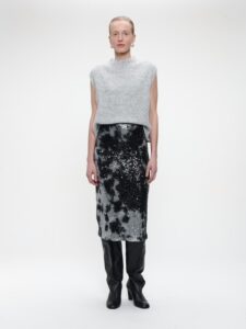 Vollflächig mit schwarzen und silbernen Pailletten besetzt, strahlt dieser Bleistiftrock pure Eleganz und Glamour aus.