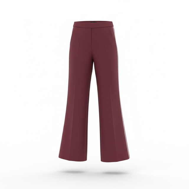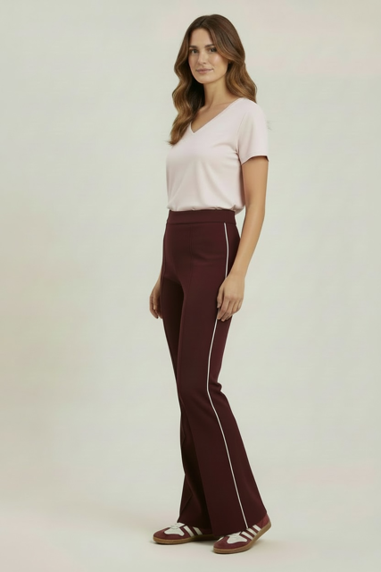 Produktbeschreibung: Diese stilvolle Flared-Hose überzeugt mit einer modernen Silhouette und einem cleanen, zeitlosen Look. Der leicht ausgestellte Beinverlauf sorgt für eine feminine Linie und streckt optisch das Bein – perfekt für einen eleganten Auftritt im Alltag, im Büro oder zu besonderen Anlässen. Die feine Seitenpaspel setzt einen dezenten Akzent und verleiht der Hose eine sportlich-elegante Note.