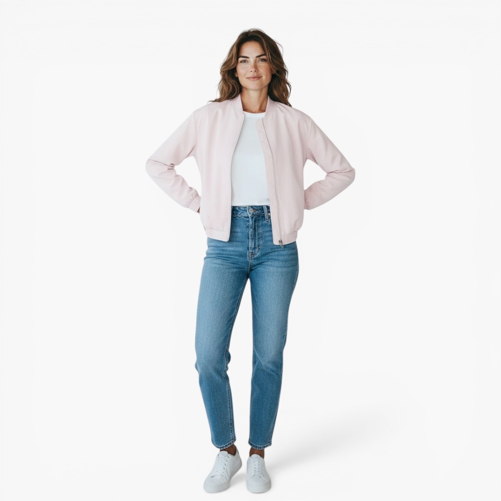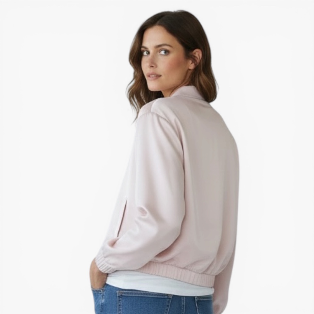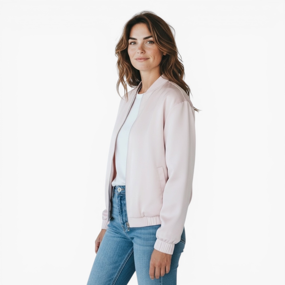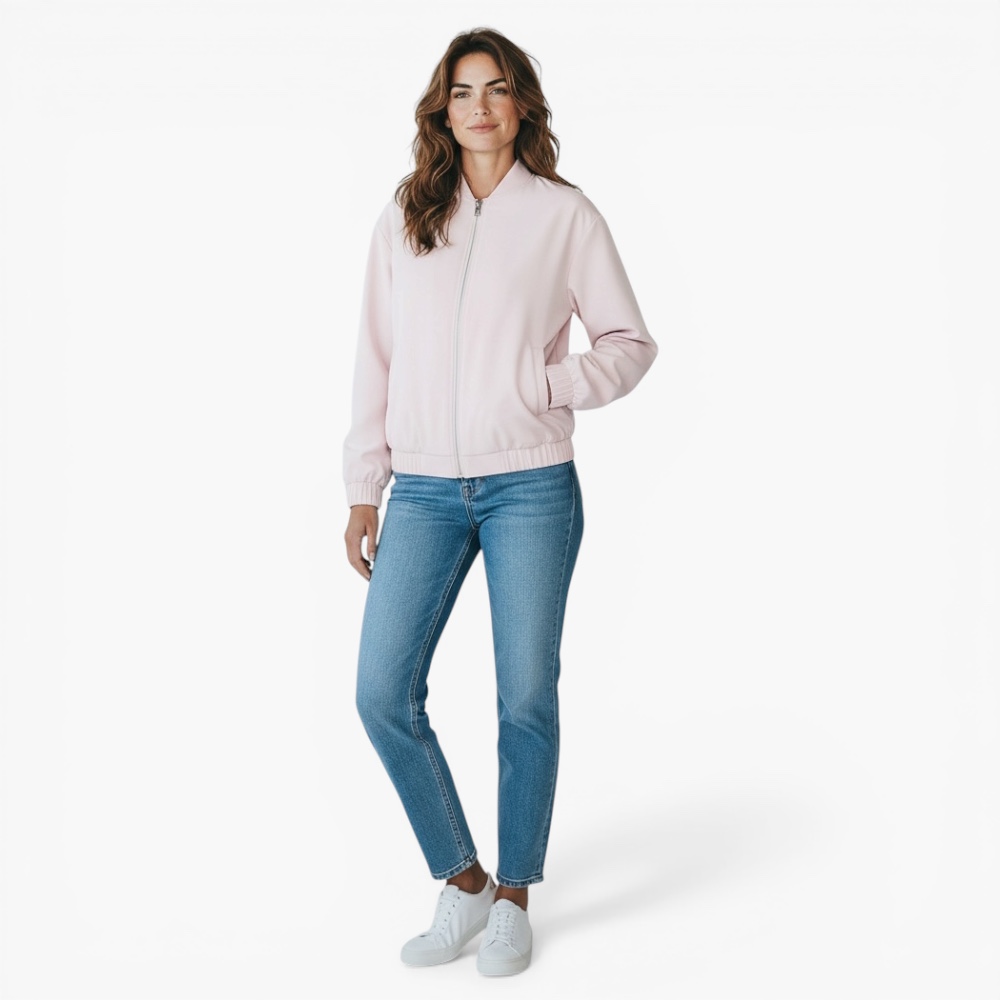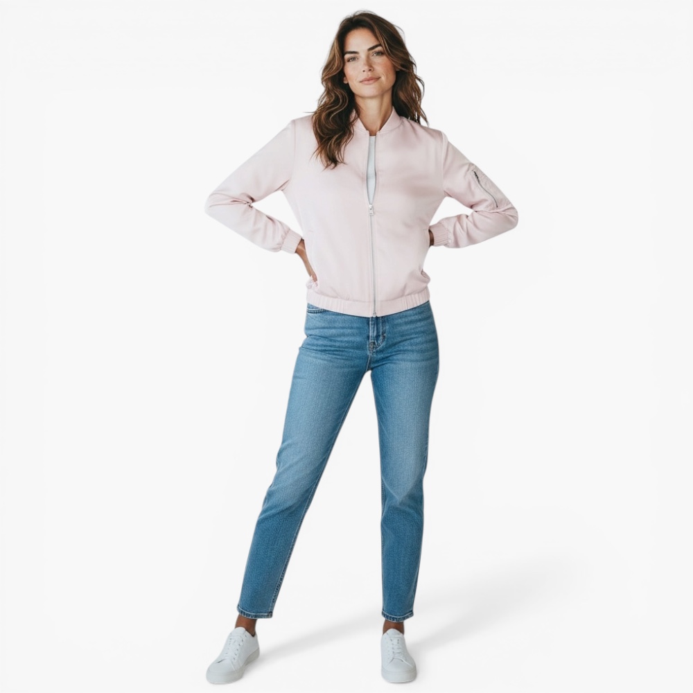 Diese femininen Bomberjacke in zartem Rosa ist der perfekte Begleiter für die neue Saison. Der klassische Blouson-Schnitt mit Rippbündchen an Saum, Ärmeln und Kragen verleiht ihr ihren unverwechselbaren Look, während das hochwertige Techno Jersey aus italien patentierten Stretch-Fasern für ein leichtes, körpernahes Tragegefühl sorgt.