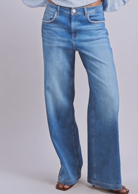 Bring einen Hauch von 70er-Jahre-Flair in ihre Garderobe mit dieser hoch sitzenden Jeans mit weitem Bein aus blauem Denim. Mit ihrer atemberaubenden mittelblauen Waschung und der handgefertigten Dreiecksstickerei auf der Vorder- und Gesäßtasche versprüht sie einen Hauch von Bohème. Sie können sie mit einer fließenden Bluse kombinieren, um einen sorglosen Vintage-Look zu kreieren.