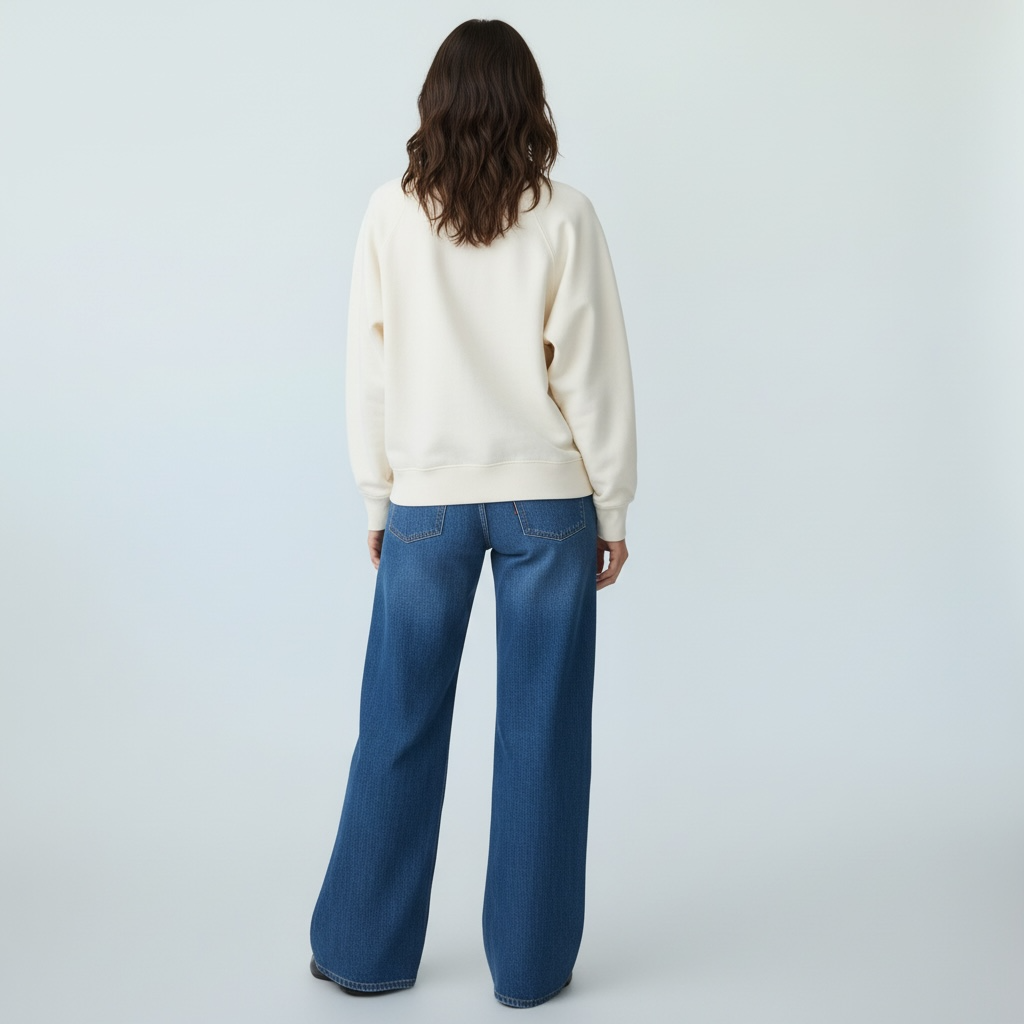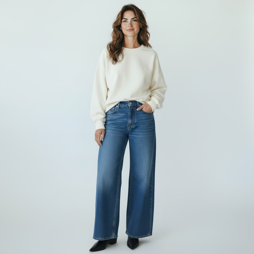 Ob barfuß mit weißem T-Shirt für den entspannten Alltag, mit cremefarbenem Oversized-Sweatshirt und schwarzen Mules für einen modernen Casual-Look oder elegant mit Blazer und Absatz, diese Wide Leg Jeans ist dein vielseitiger Begleiter für jede Gelegenheit.