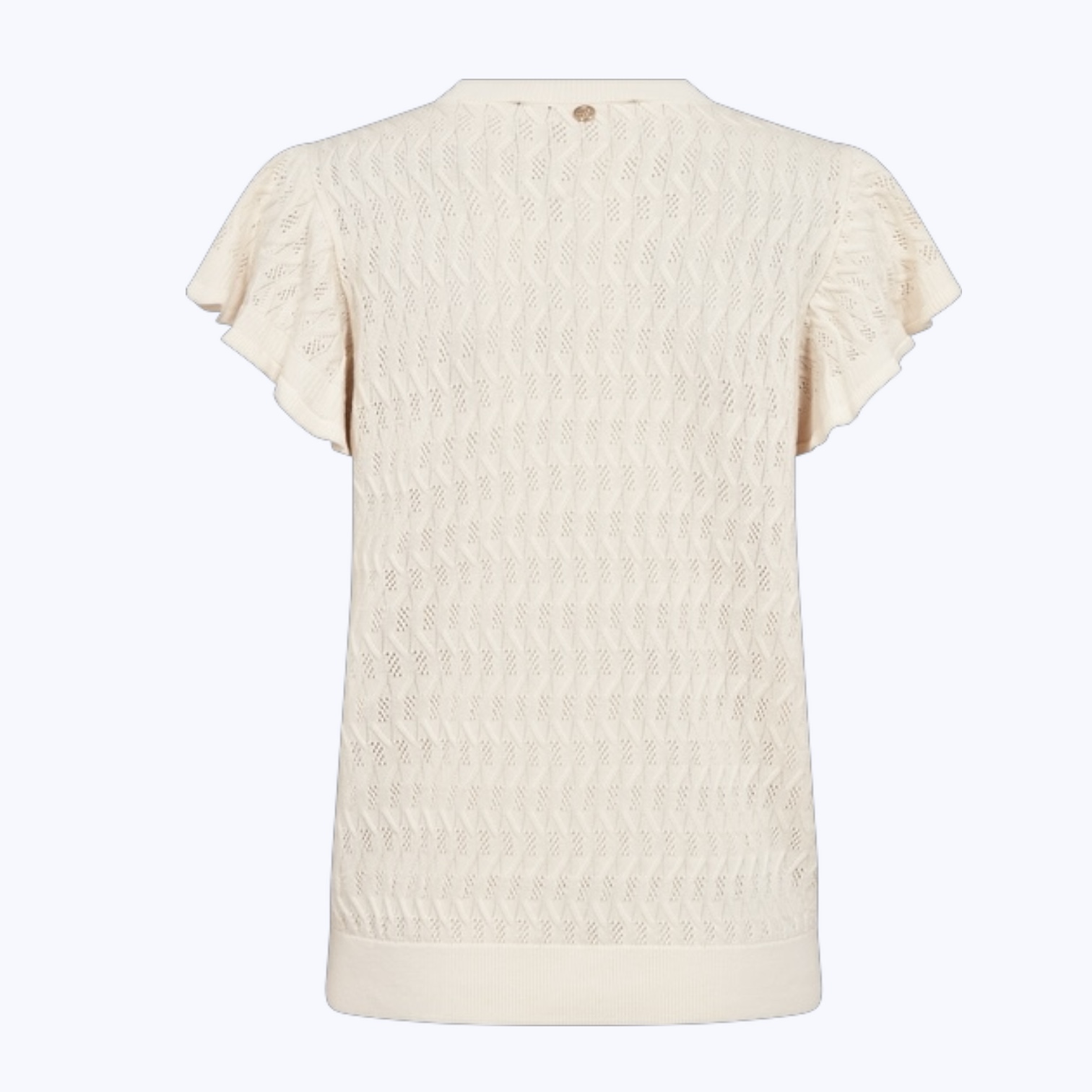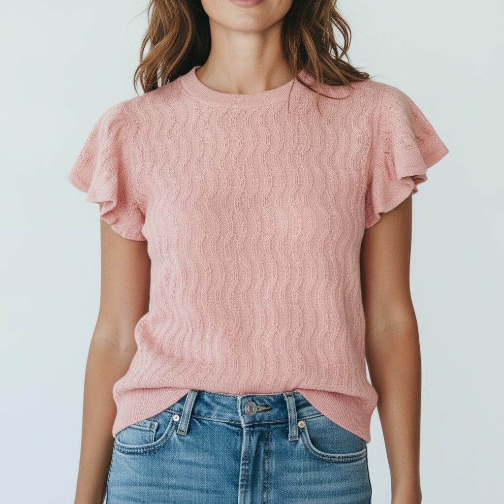 Dieses zarte Strick-Top vereint femininen Charme mit sommerlicher Leichtigkeit: Die Rüschenärmel sorgen für einen verspielten, romantischen Look, während das fein strukturierte Ajour-Strickmuster dem Top eine besondere Textur verleiht. Der Rundhalsausschnitt und der Rippenbund am Saum geben dem Stück eine klare, gepflegte Form.
