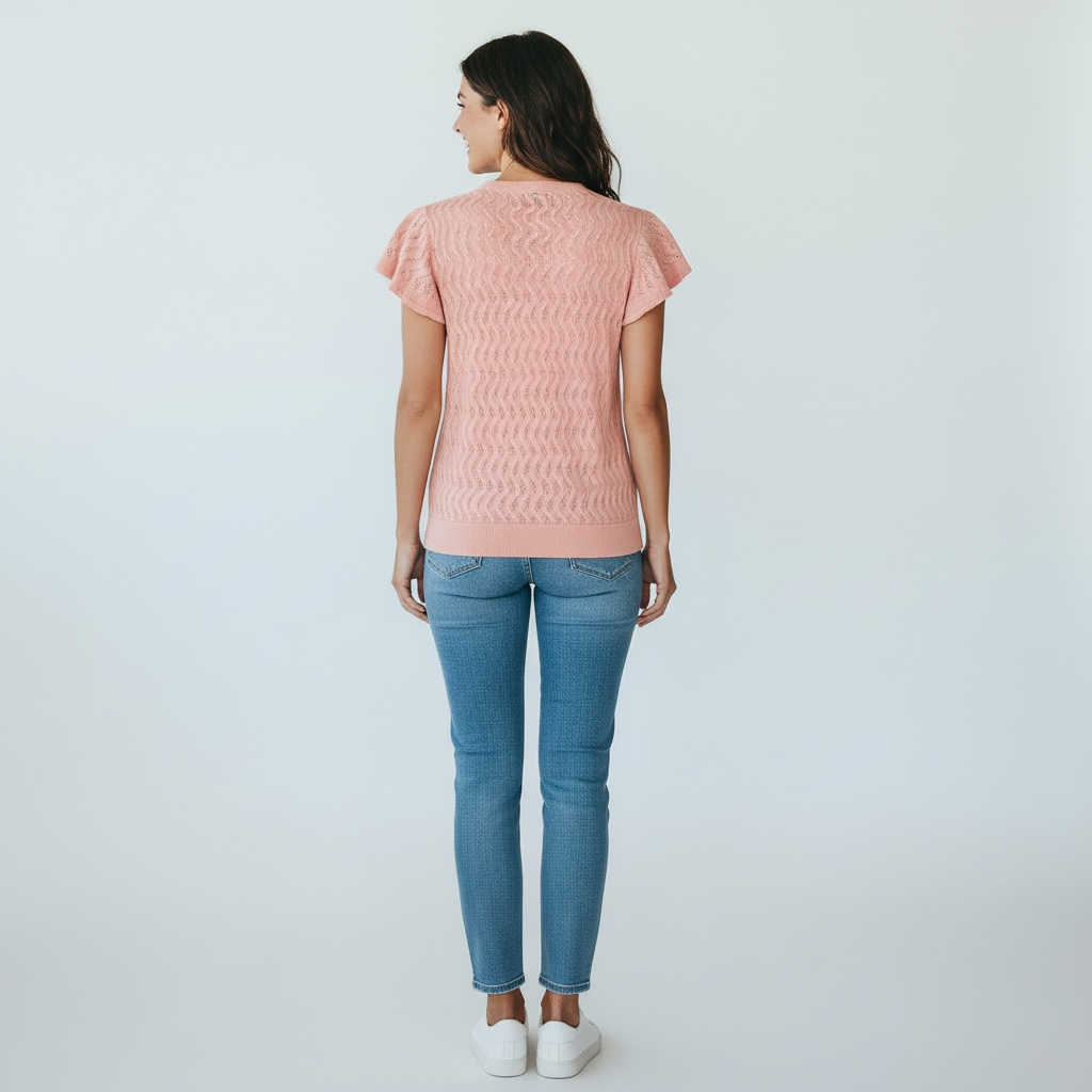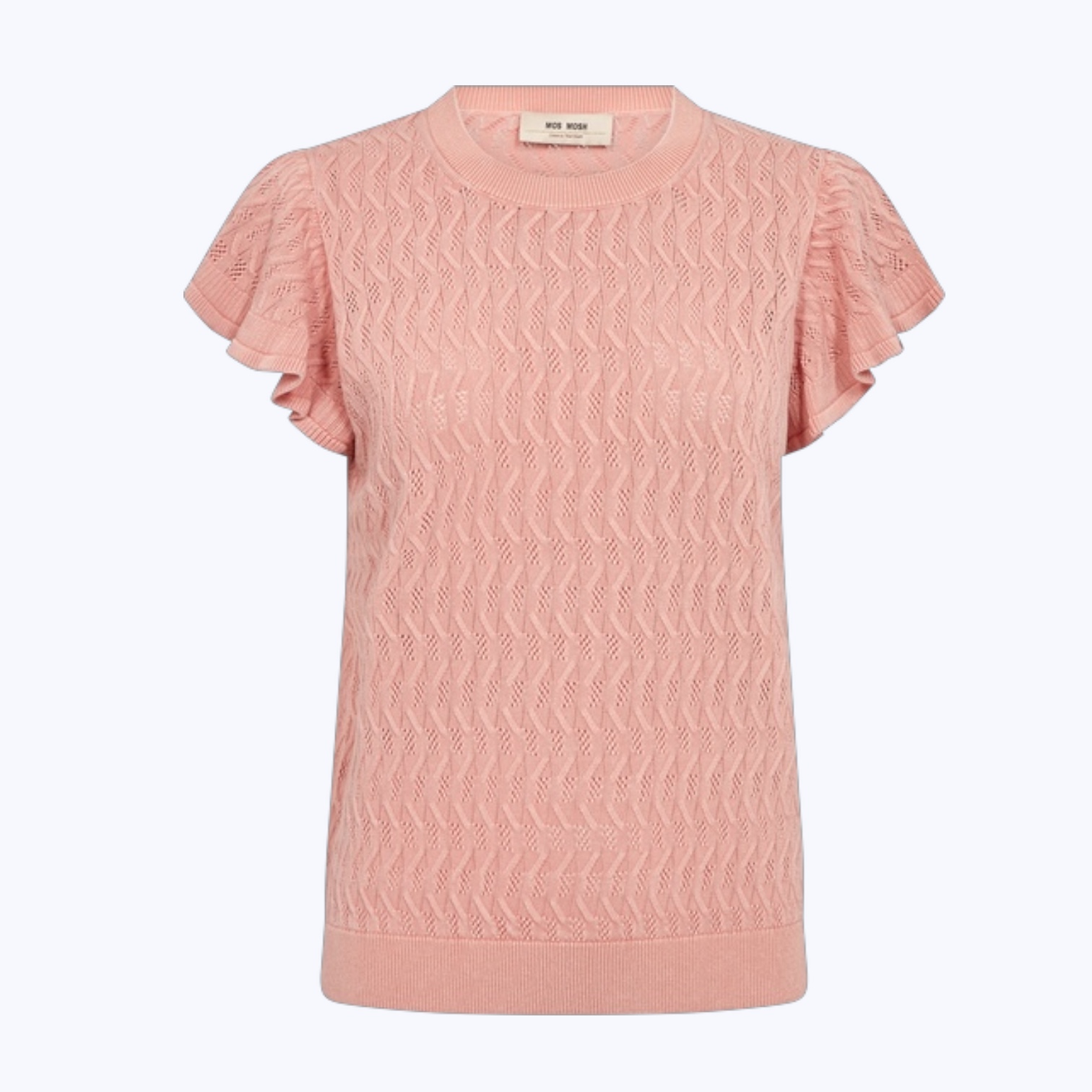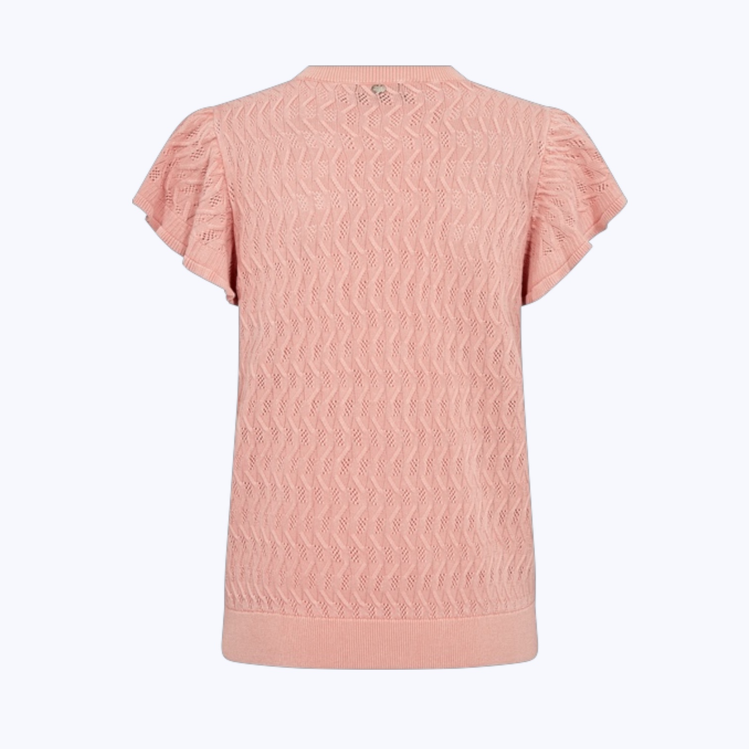 Verspieltes Strick-Top aus 100 % Baumwolle mit Rüschenärmeln und Ajour-Muster in Peachy Pink.
