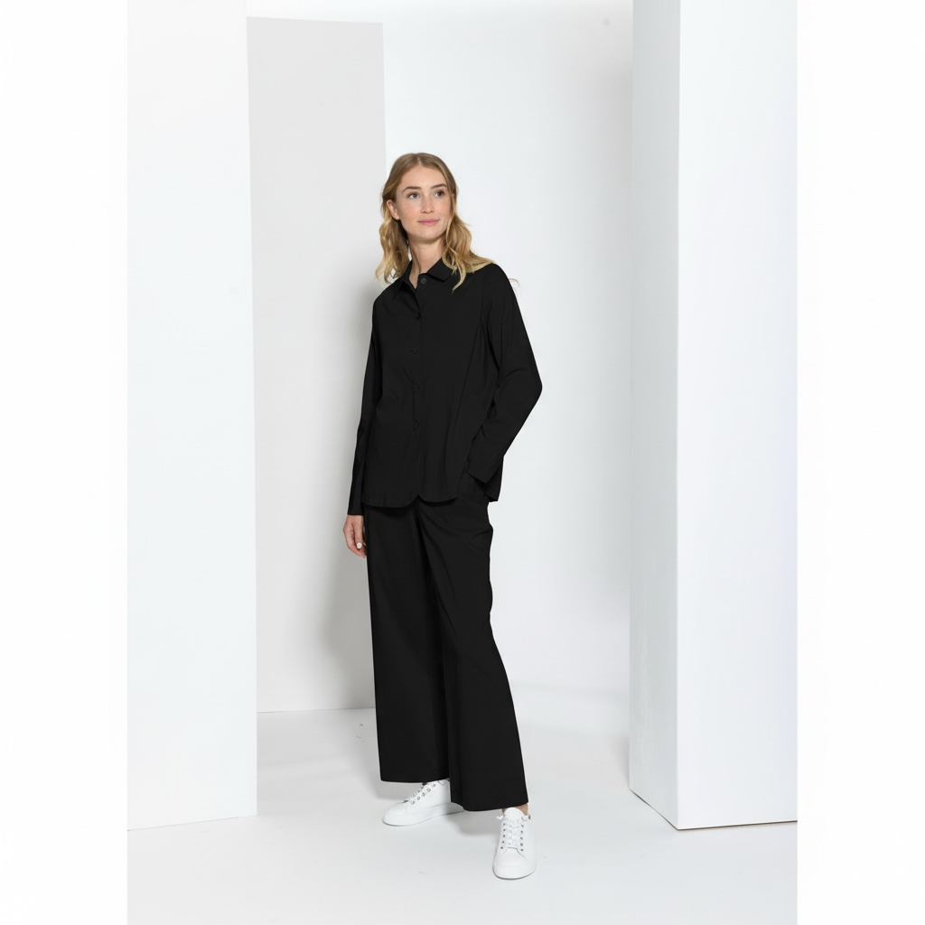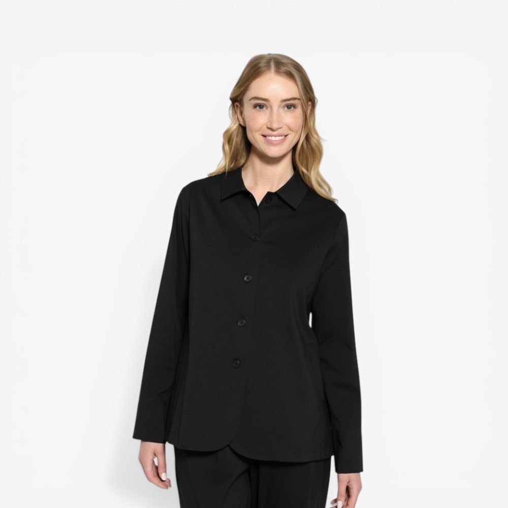 Elegante Vetono Jacke mit Kragen in zeitlosem Schwarz. Lockere Silhouette, Knopfleiste, leicht gerundeter Saum.