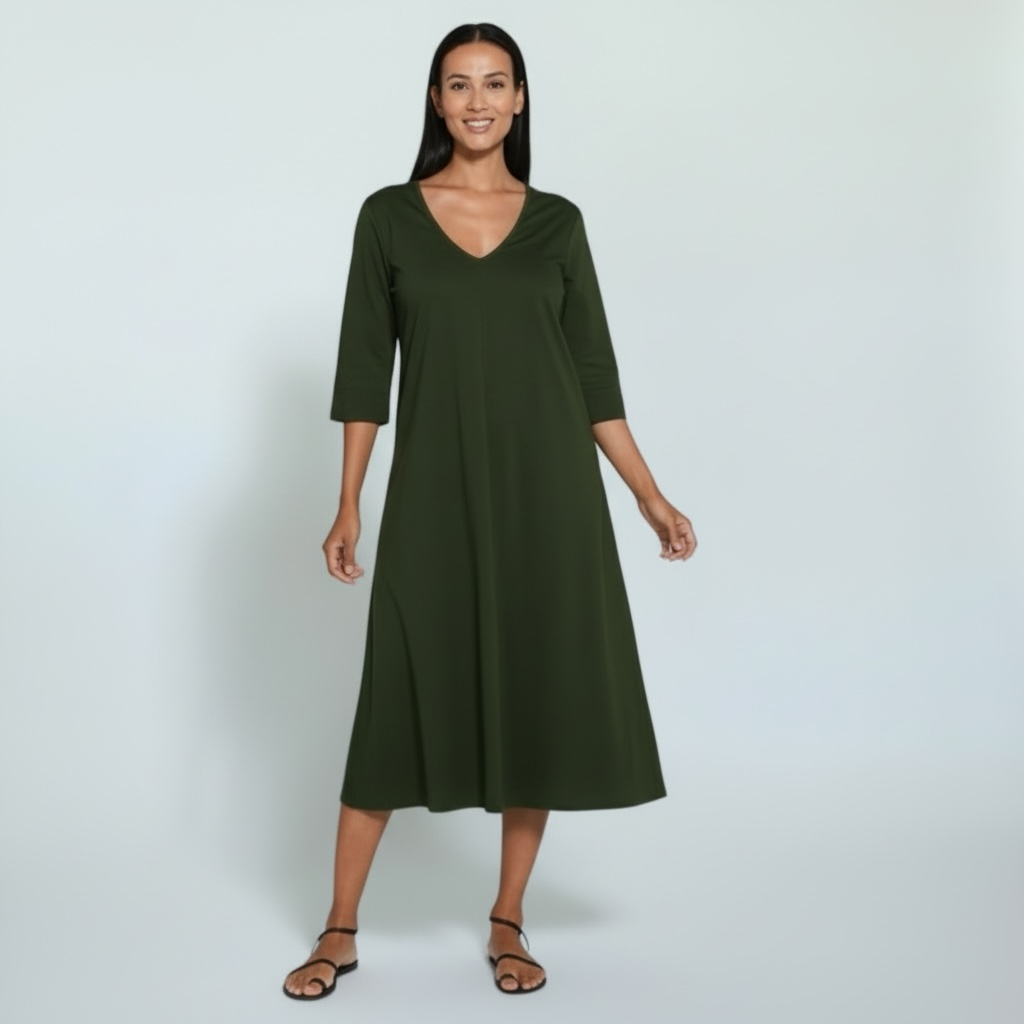 Der sanfte V-Ausschnitt schmeichelt dem Dekolleté, ohne aufdringlich zu wirken. Die weit ausgestellte A-Linie fließt leicht und luftig und sorgt dafür, dass das Kleid an jeder Figur wunderbar sitzt. Der 3/4-Arm macht es zum idealen Begleiter für den Frühling, Sommer und die warmen Herbsttage.