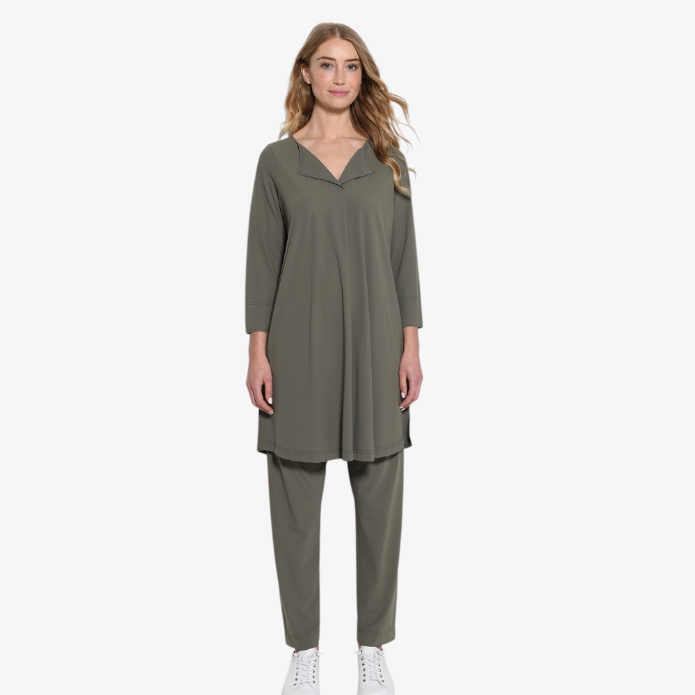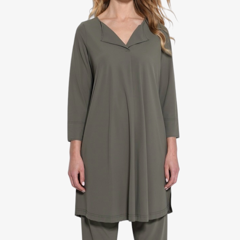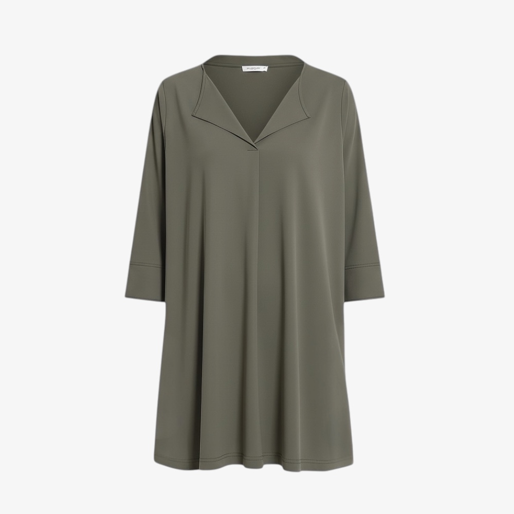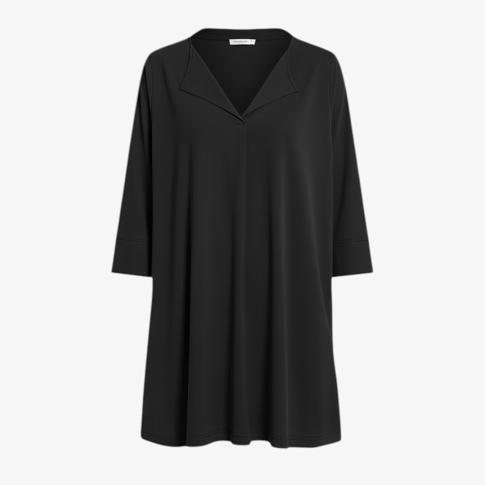 Der elegante offene Reverskragen mit V-Ausschnitt setzt ein stilvolles Highlight und verleiht der Tunika einen edlen, fast couture-artigen Touch. Die 3/4-Ärmel mit sauberem Abschluss und die seitlichen Schlitze am Saum sorgen für eine angenehme Bewegungsfreiheit. Dank der großzügigen Länge lässt sie sich wunderbar als lange Tunika, Mini-Kleid oder elegante Bluse über einer Hose tragen.