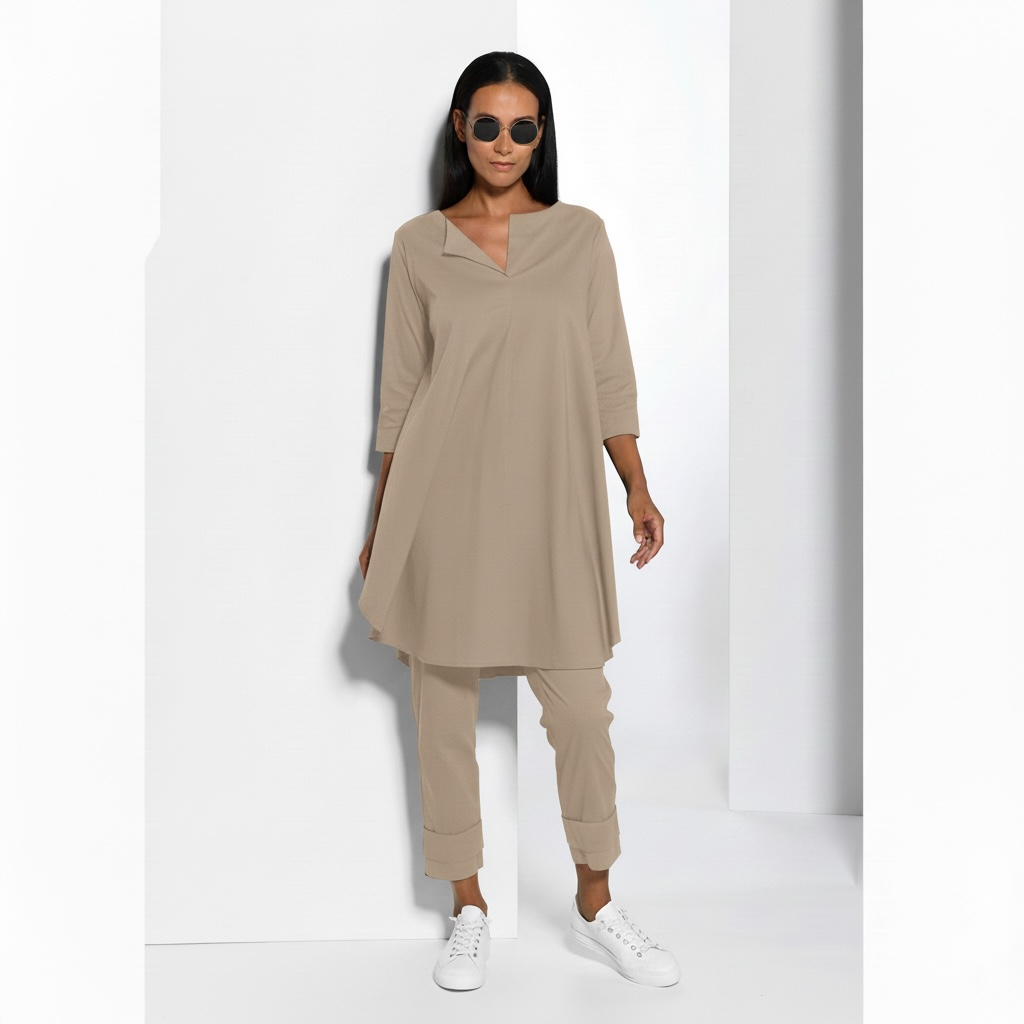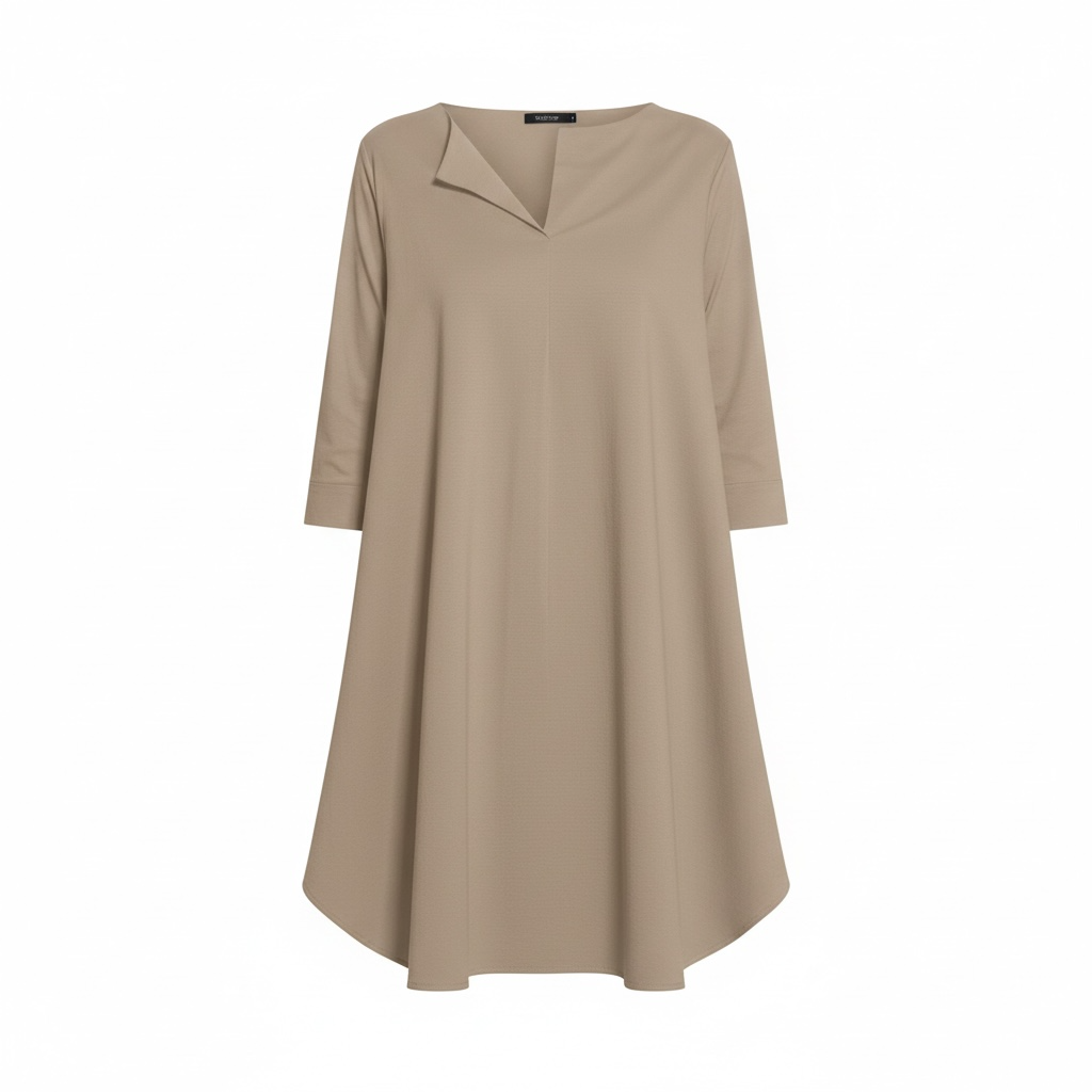 Der weit schwingender A-Linien-Schnitt mit asymmetrischem Saum verleiht dieser Tunika ihren unverwechselbaren Charakter: vorne kürzer, hinten fließend länger, ein Statement-Piece, das sich von der Masse abhebt. Die 3/4-Ärmel mit sauberem Umschlag machen sie zur idealen Begleiterin durch alle Jahreszeiten.
